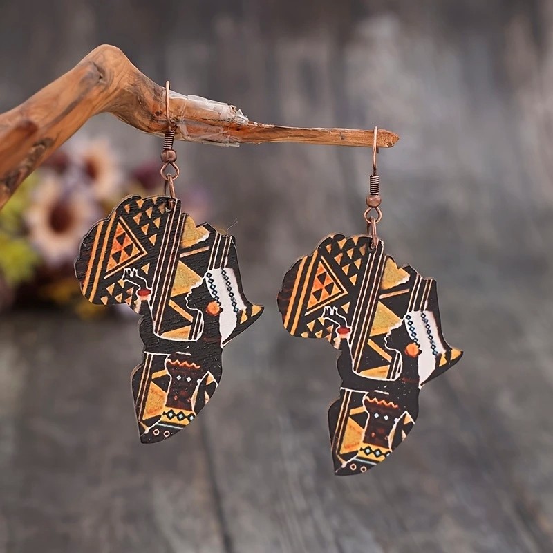 Pair of Vintage Wooden Earrings - Africa Map & Sunset Silhouette Design, Recycled Wood with Iron Hooks, Lightweight Everyday Jewelry for Women, Cultural Geography Art
