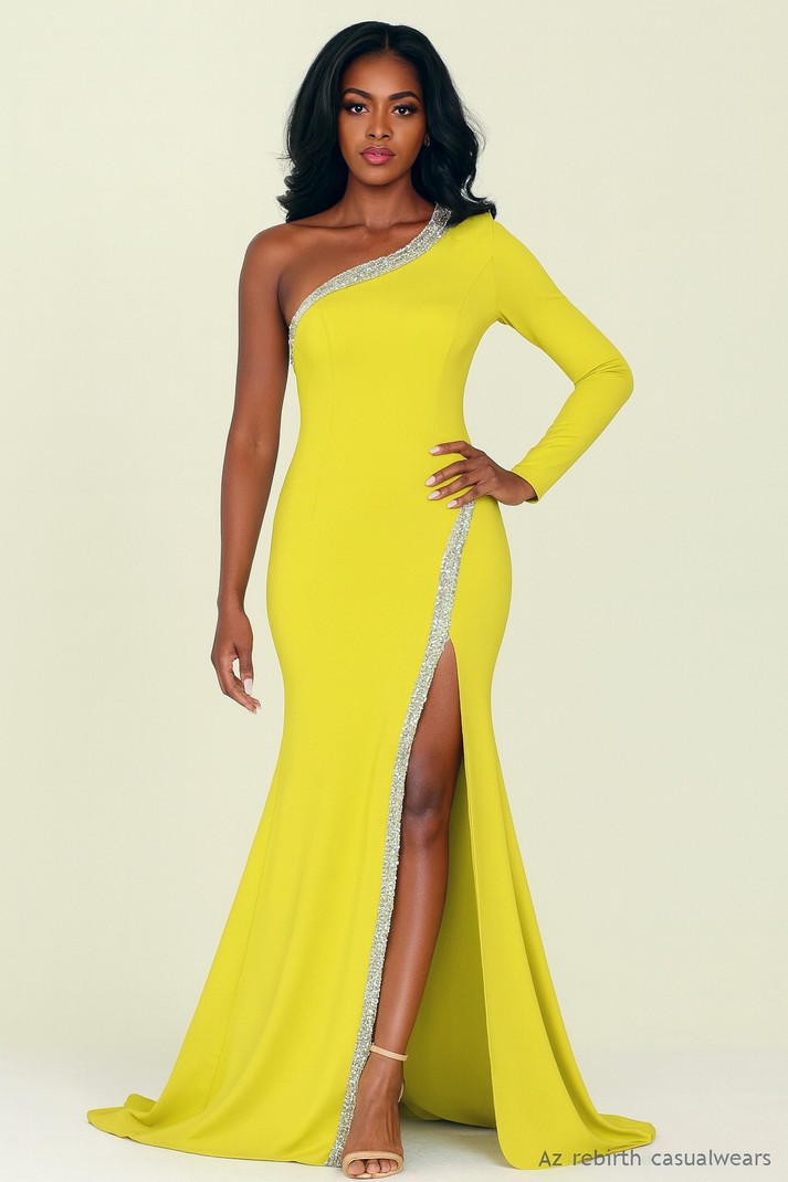 Beautiful yellow long dress with one shoulder design. It has shiny crystal decoration on the neckline and along a high side slit. The dress is fitted and elegant, perfect for parties, weddings, and special events. Available in all sizes.