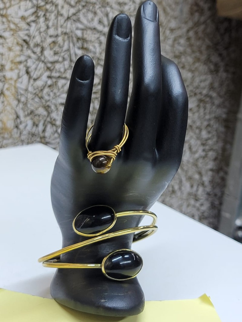 This elegant set features a gold-tone cuff bracelet with a sleek black onyx stone and a matching ring with a captivating amber gem. Perfect for adding a touch of mystery and sophistication to your style. Shop now!