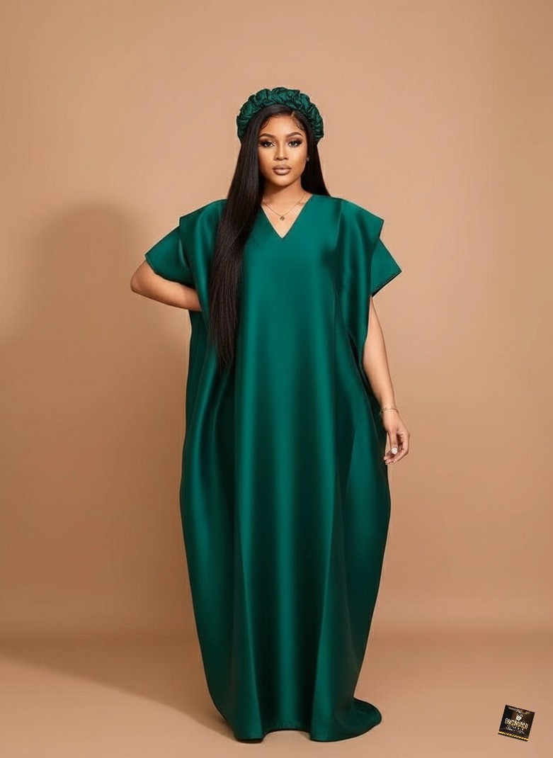 This stunning floor-length kaftan, exuding effortless glamour, is crafted from a luxurious, smooth, satin fabric in a rich, warm green hue. The garment is designed with a dramatic, oversized, and free-flowing silhouette, ensuring maximum comfort and an elegant drape as the fabric moves. It features a simple V-neckline and wide, short kimono sleeves, maintaining a clean and minimalist aesthetic that allows the opulent color and the beautiful sheen of the material to be the central focus. This piece is finished with a matching, ruched fabric headband, elevating the ensemble to a sophisticated look perfect for special occasions or resort wear.