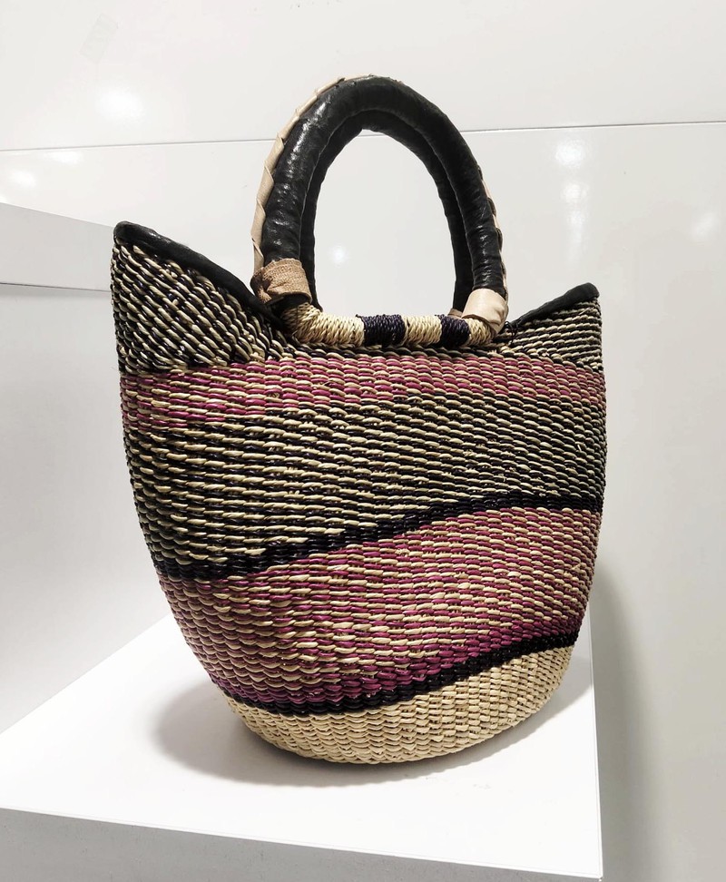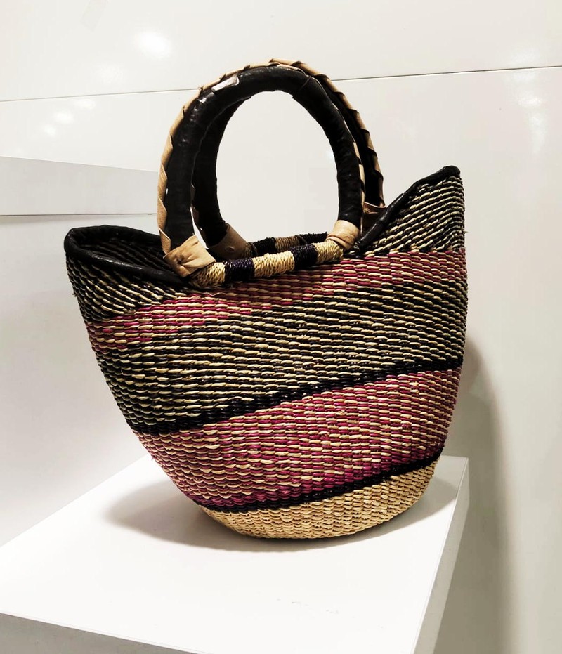 Beau panier en paille tissé avec anses en cuir fabriqué artisanalement au burkina Faso .