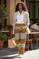 Son tissu wax haut de gamme, dominé par des tons chauds d’orange et de jaune, est rehaussé de motifs géométriques noirs et blancs qui équilibrent la composition. Sa coupe droite ample flatte la silhouette tout en assurant un confort optimal.