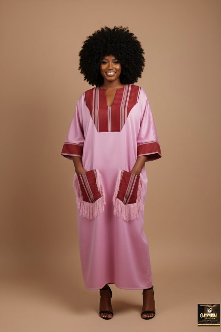 Turn heads in this luxurious pink satin kaftan adorned with burgundy woven panels and fringe-trimmed pockets. Its glossy finish and relaxed fit exude elegance, while the textured details add a unique, playful edge. Perfect for events, dinner dates, or stylish lounging, this piece embodies femininity and sophistication. Material: handwoven aso-oke Color: Multicolor