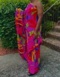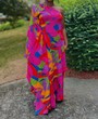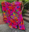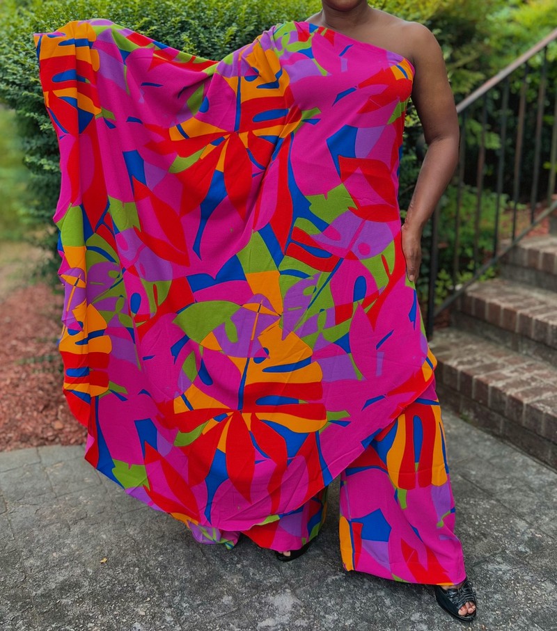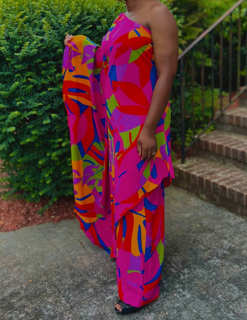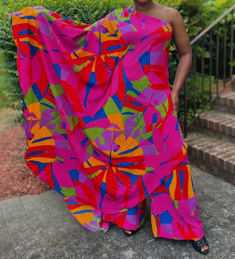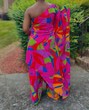 Pink Multicolor Abstract print one shoulder asymmetrical top and pants set