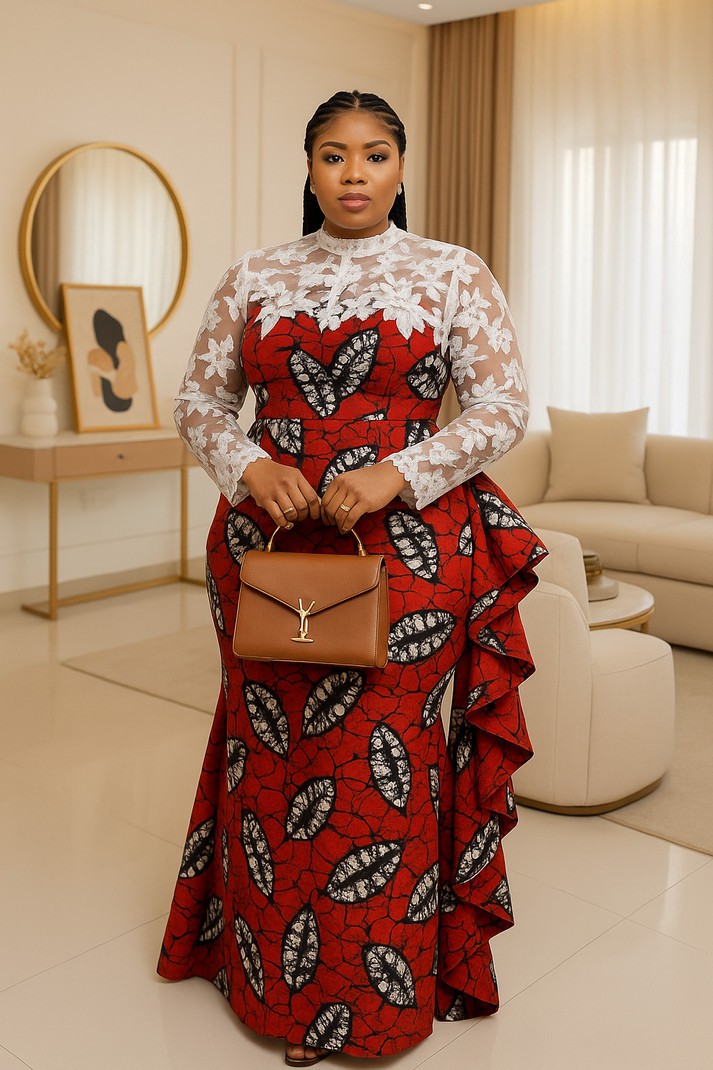 This breathtaking gown is a beautiful blend of rich red Ankara and delicate white floral lace, designed to give you a timeless, classy, and feminine look. The lace bodice adds a soft, luxurious touch, while the Ankara skirt brings bold cultural elegance with its unique leaf patterns. The dramatic side ruffle detail elevates the entire outfit, making it perfect for women who love standout fashion with a refined finish. Ideal for: ❤️ Weddings & receptions ❤️ Birthday photoshoots ❤️ Church events ❤️ Special occasions & celebrations This gown brings together modesty, style, and sophistication, making it a must-have wardrobe piece.