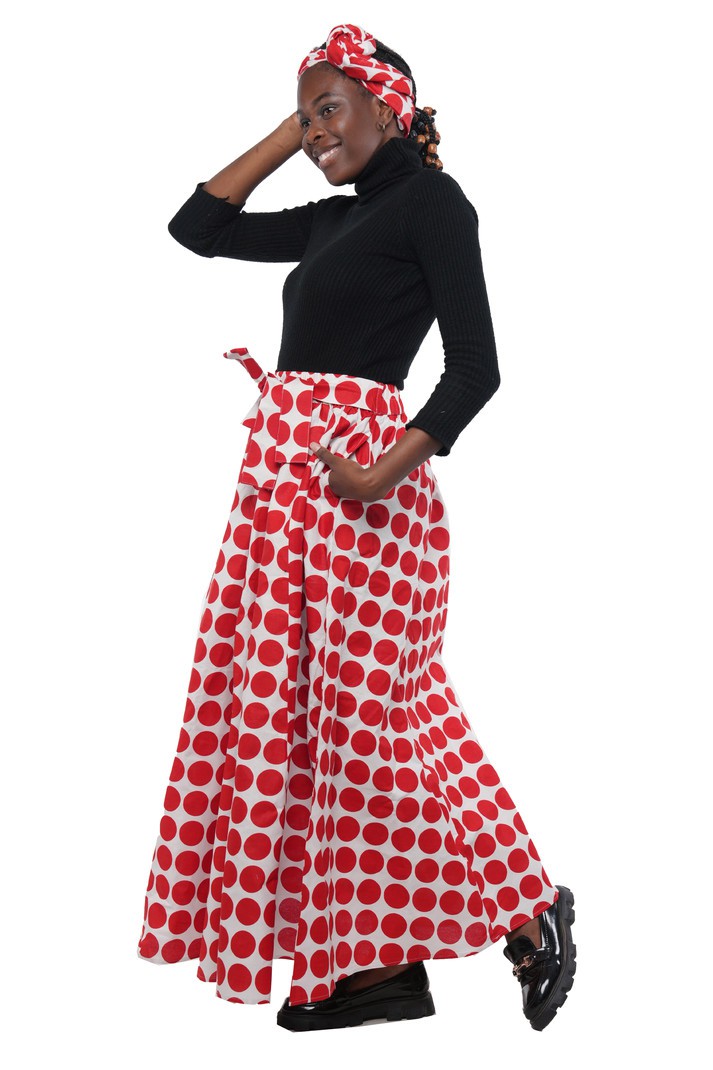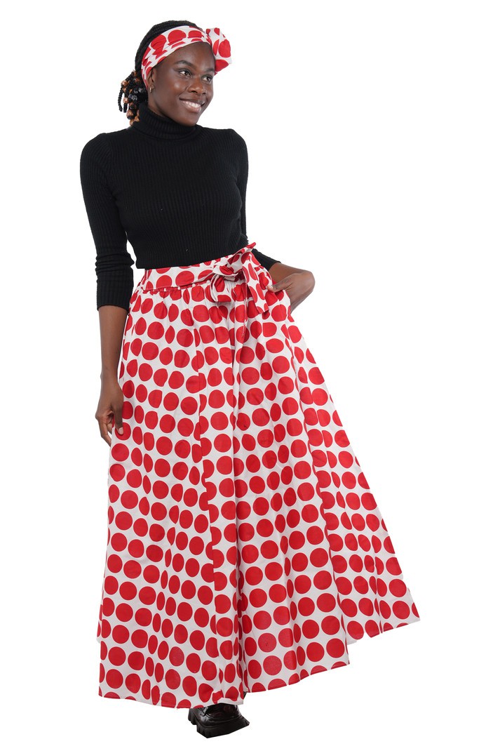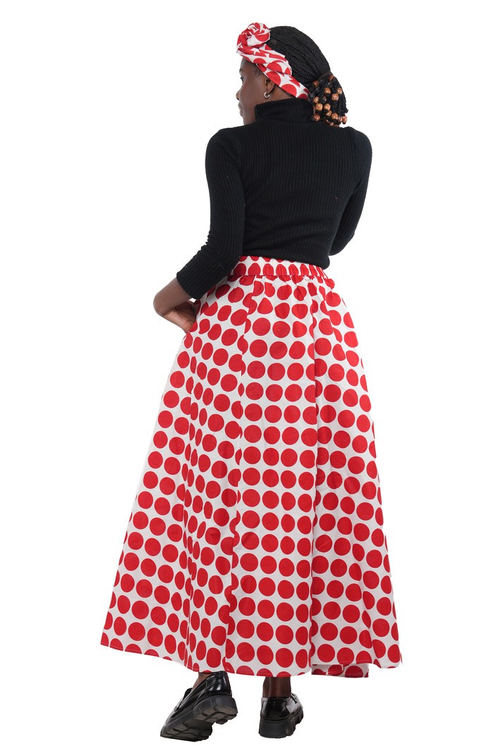 Upgrade your wardrobe with this stylish and practical polka dot maxi skirt – the perfect blend of fashion and function!