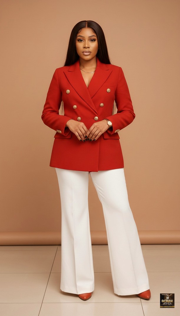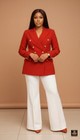 Make an unforgettable entrance in this high-contrast ensemble. The centerpiece is a structured, double-breasted blazer in a striking crimson red, featuring sharp peak lapels and six polished gold military-style buttons that add a touch of luxury. The jacket is tailored to nip in slightly at the waist, creating a strong silhouette. It is paired with pristine white, high-waisted trousers that flare gently at the hem, balancing the bold top with clean, fluid lines.