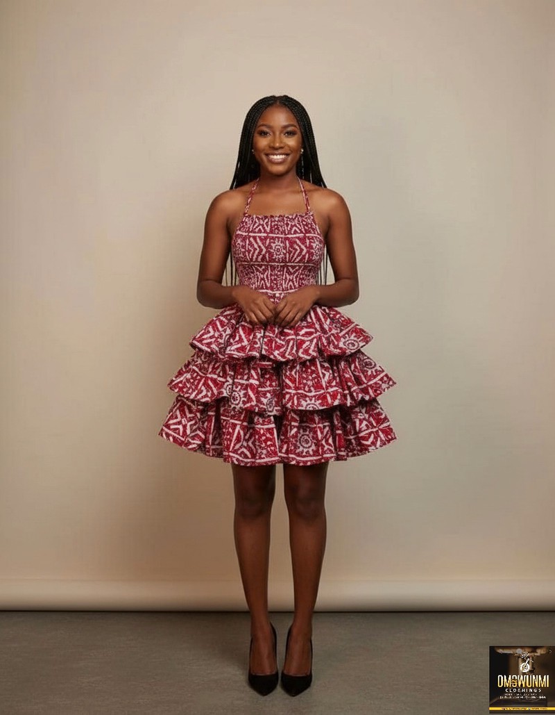 Make a statement in this stunning red smocked gown designed with layers of cascading ruffles. The fitted bodice features adjustable shoulder ties for a comfortable fit, while the voluminous skirt adds playful movement and drama. Crafted from soft ankara fabric with a rich red and white pattern, this dress is perfect for special occasions, photoshoots, or elegant dinners or weddings, or namings or casual events.