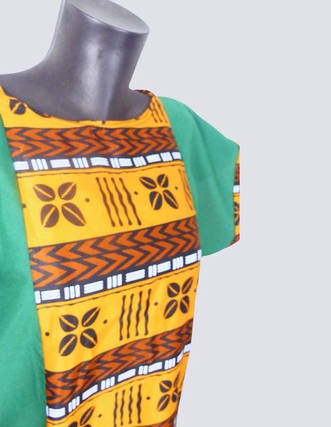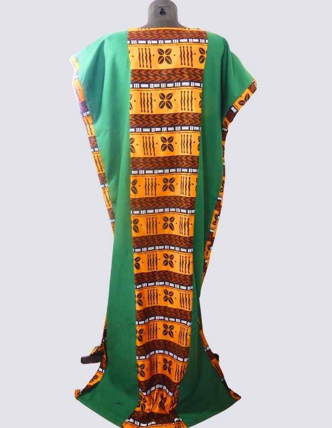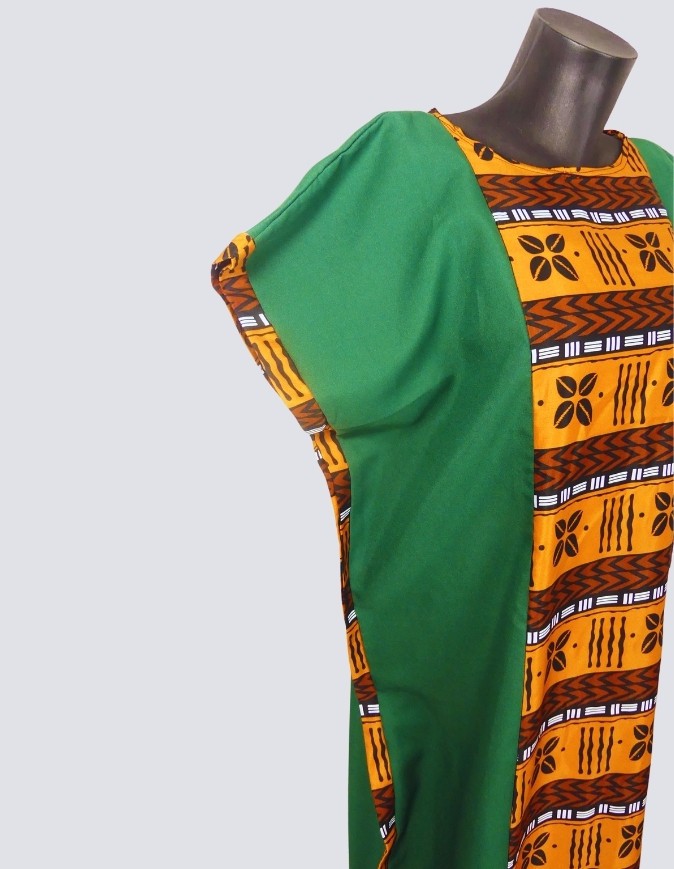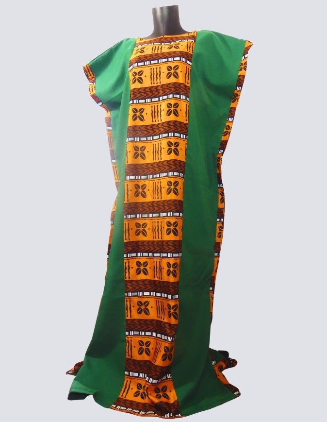 robe longue boubou robe tunique bogolan vert caftan africain en wax S/M/L/XL tissu satin de soie motifs bogolan et polycoton uni grande bande bogolan en satin de soie à l’avant et l’arrière de la robe