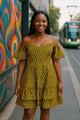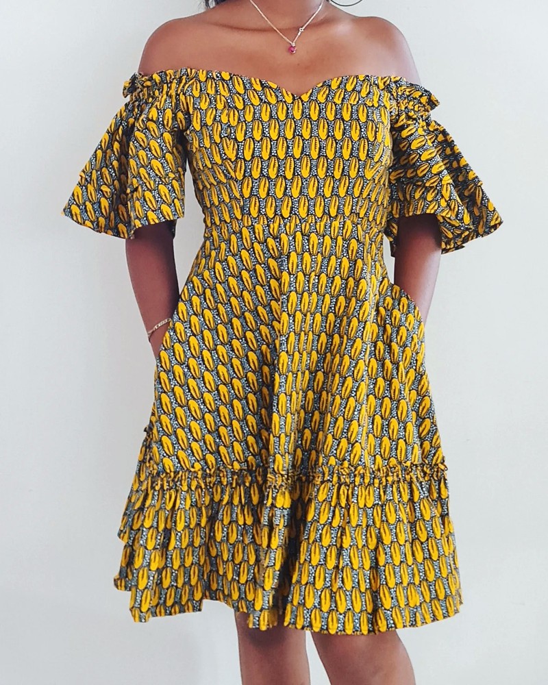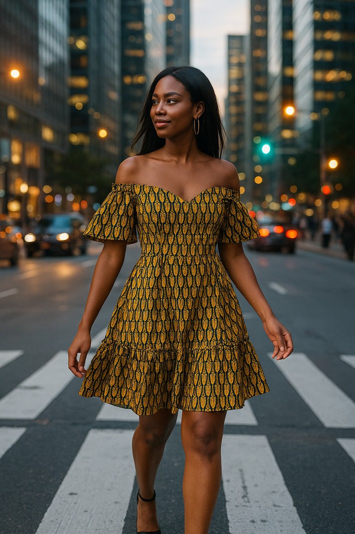 Apportez une touche vibrante et élégante à votre garde-robe avec cette robe courte à épaules dénudées, confectionnée dans un tissu wax africain aux motifs géométriques jaunes et noirs. Cette pièce fluide et féminine est parfaite pour les journées ensoleillées, les sorties estivales ou les événements festifs.