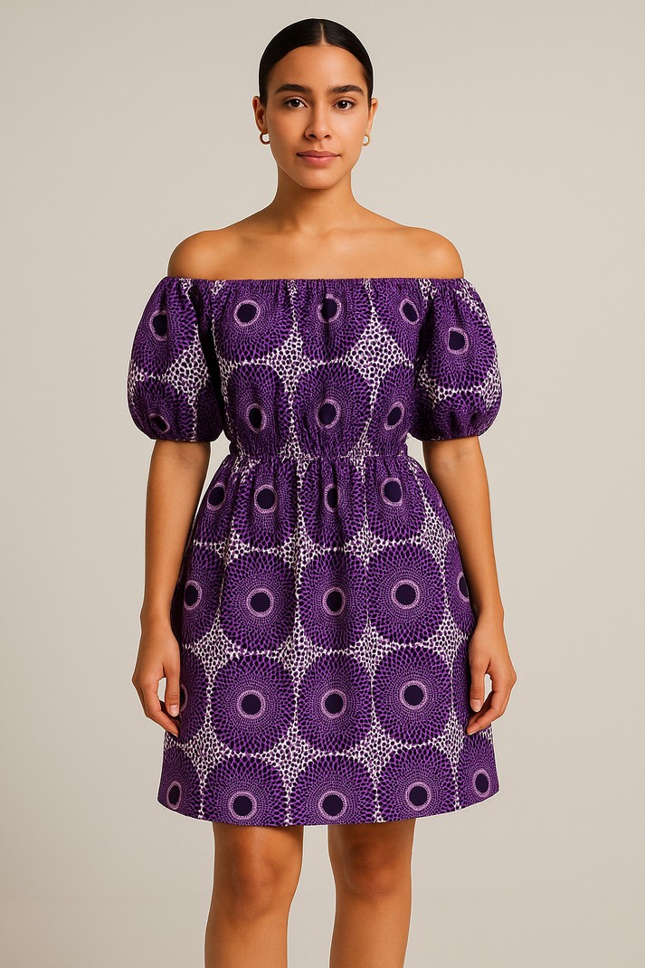Cette robe est une robe ample à épaules dénudées, confectionnée dans un tissu à motifs africains colorés. Elle présente des manches courtes évasées et une coupe fluide, ce qui lui confère un style à la fois décontractée.
