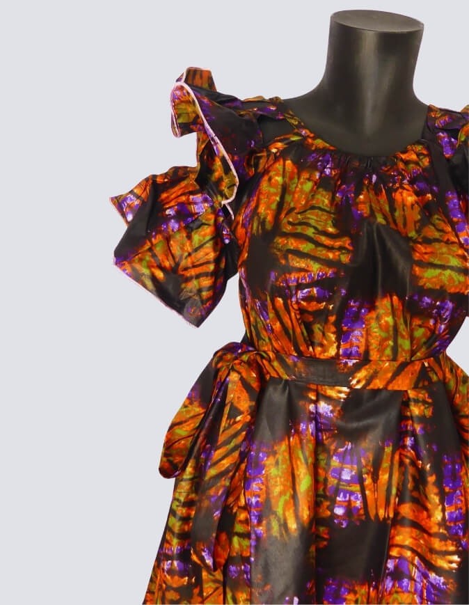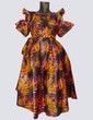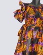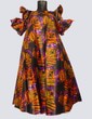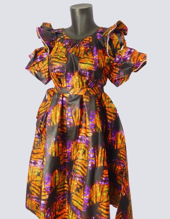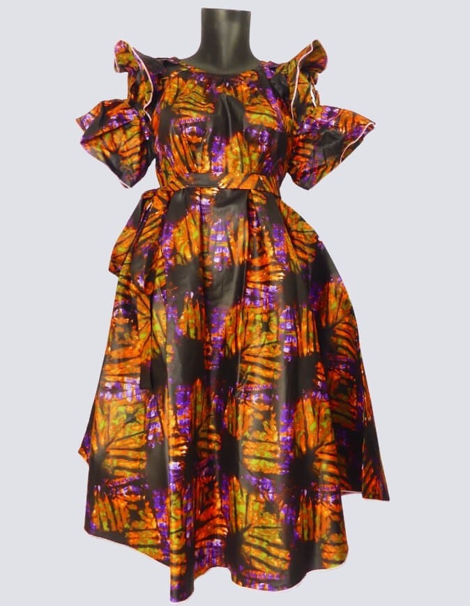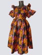 Très Jolie robe évasée imprimée en bazin mi-longue. Manches courtes, évasée, ce qui permet une meilleure aisance et la possibilité d’enfiler la robe quelque soit la taille. La robe est évasée, légère et Idéale pour l’été, se porte en toute occasion. Cordon à nouer autour de la taille.