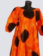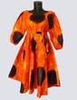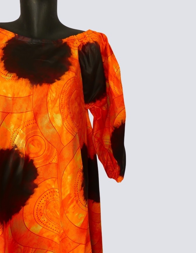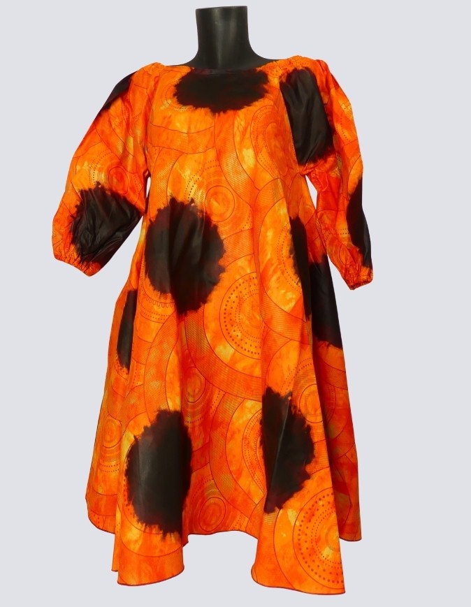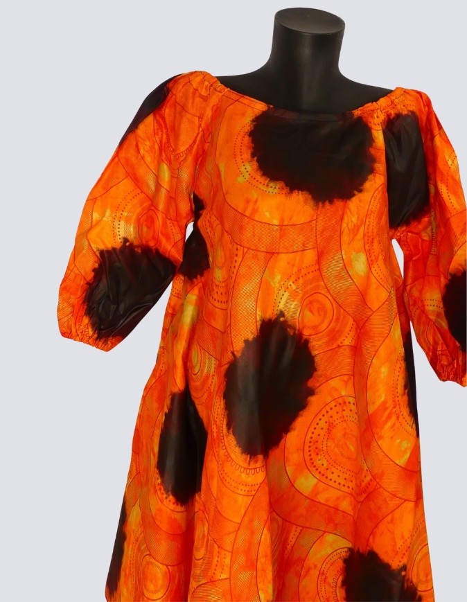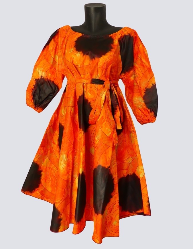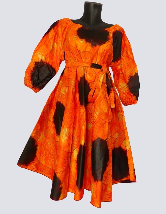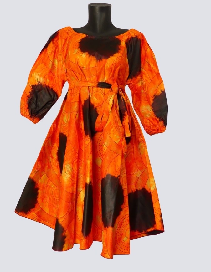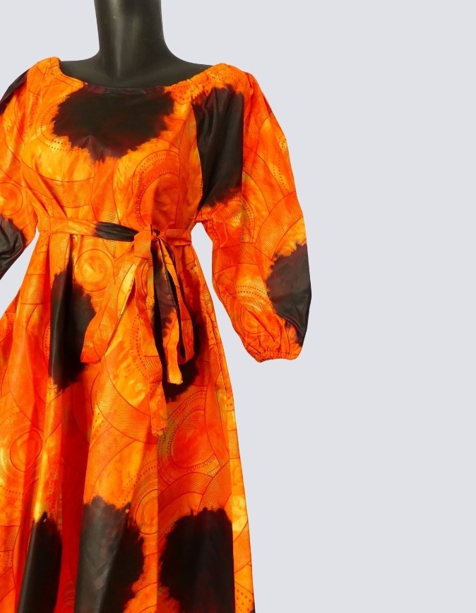Très Jolie robe évasée imprimée en bazin mi-longue. Manches 3/4 ballons, évasée, ce qui permet une meilleure aisance et la possibilité d’enfiler la robe quelque soit la taille. La robe est évasée, légère et Idéale pour l’été, se porte en toute occasion. Cordon à nouer autour de la taille.