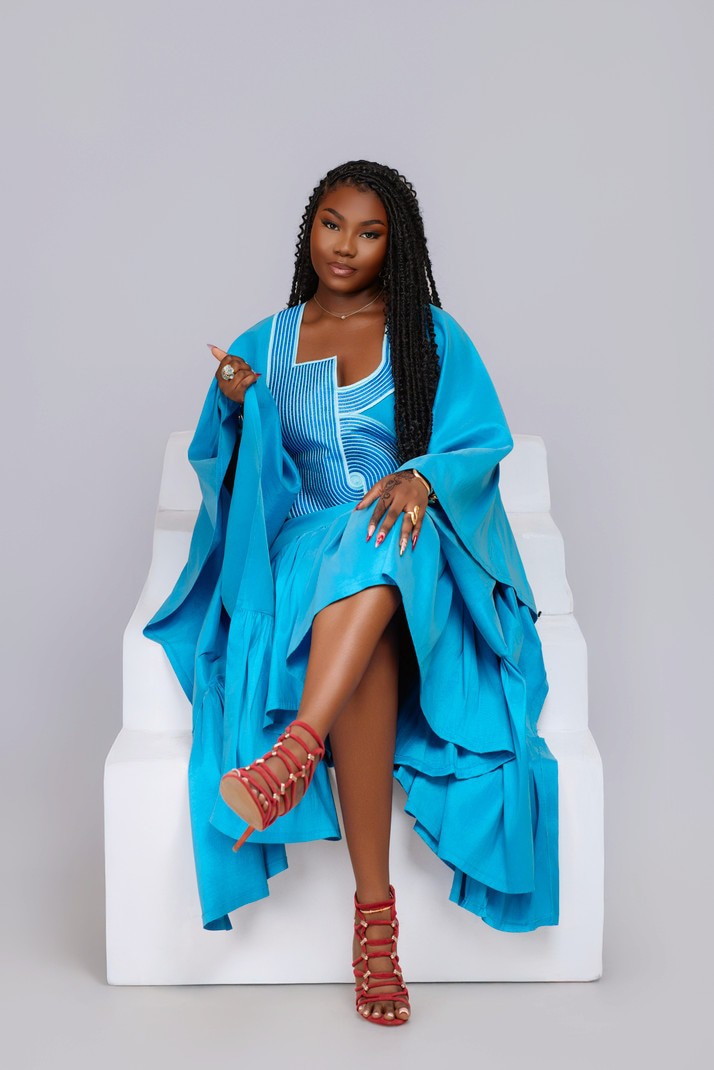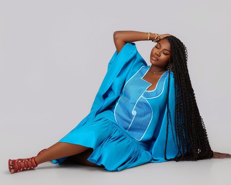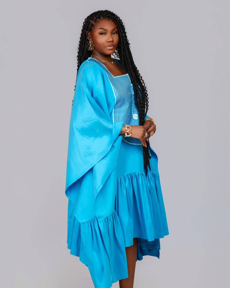 Robe avec une touche de broderie travaillée minutieusement par nos artisans , coupe légèrement évasée avec des cordons à l’intérieur pour ajuster la taille .