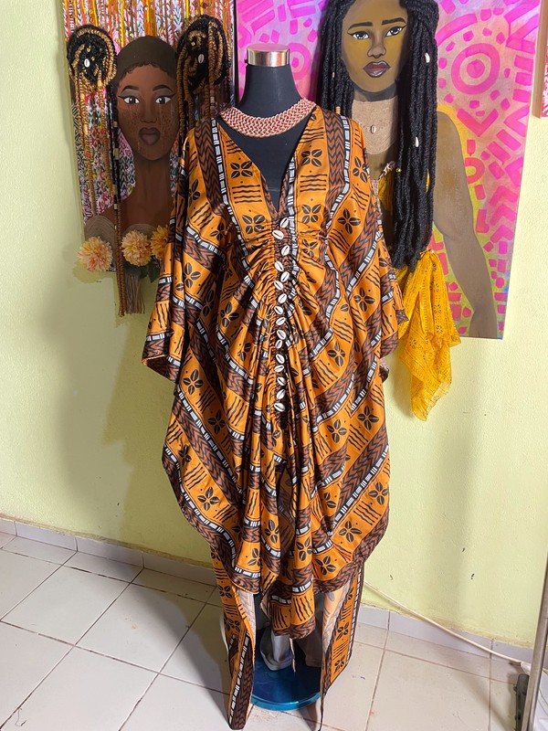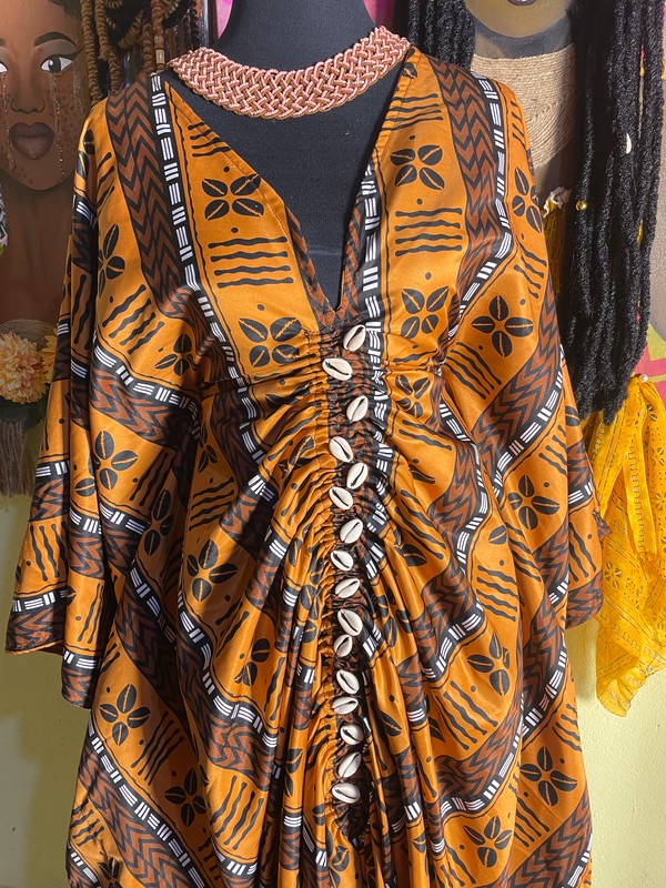 Robe fait main, authentique, décorée de cauris au centre ,à resserrer à la taille avec des lanières intérieures . Cette robe est disponible en édition limitée.