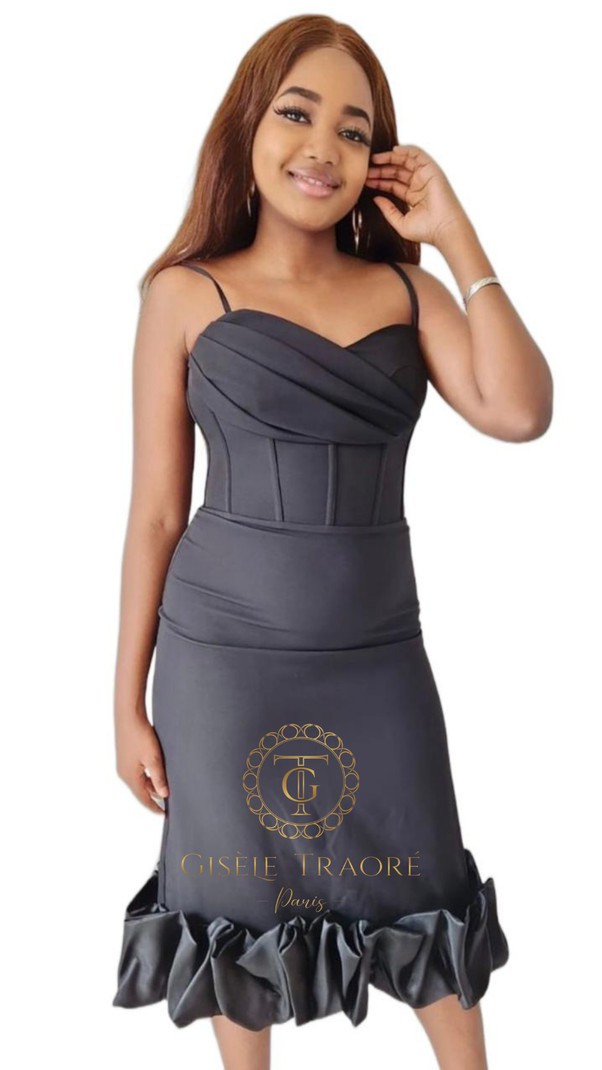 Cett robe mi-longue noire célèbre la Princesse YENNENGA dans sa royauté, sa noblesse et sa féminité.