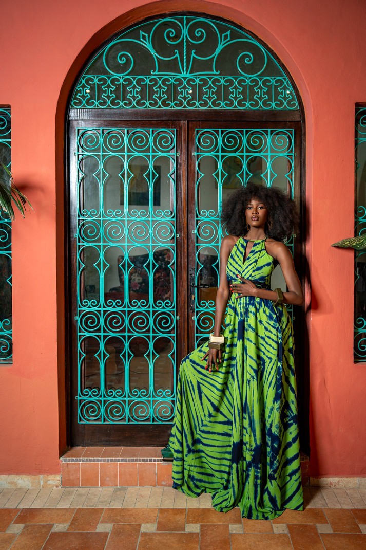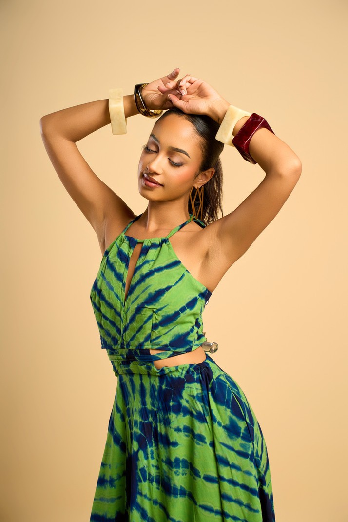 Robe longue en 100% coton tie & dye, fluide et solaire. Son dos délicatement décolleté révèle une sensualité subtile, portée par l’élégance naturelle de celles qui avancent avec grâce et confiance