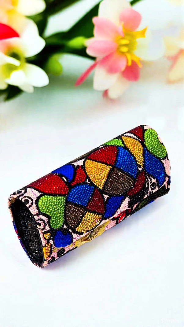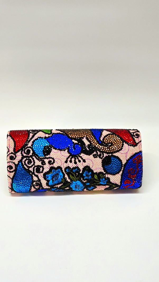 Elongated one-of-a-kind clutch encrusted with red, emerald, teal, black, and Azure crystals. Intricate Roidery™ spirals and arcs are layered with hand-set zirconia and rhinestones, shimmering from every angle. Lined in soft metallic fabric.