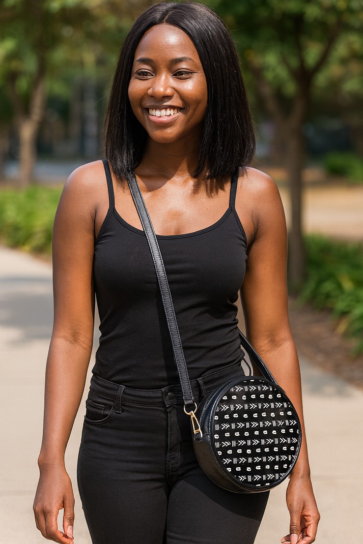 Step out in style with our Round Sling Bag featuring a unique African Cowrie Shell Print. Designed to elevate any outfit, this bag offers convenience and fashion all in one. Perfect for carrying your essentials, it's sure to turn heads and make a statement. Go ahead, make a bold fashion statement with our Round Sling Bag!