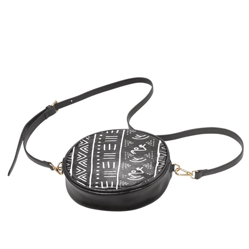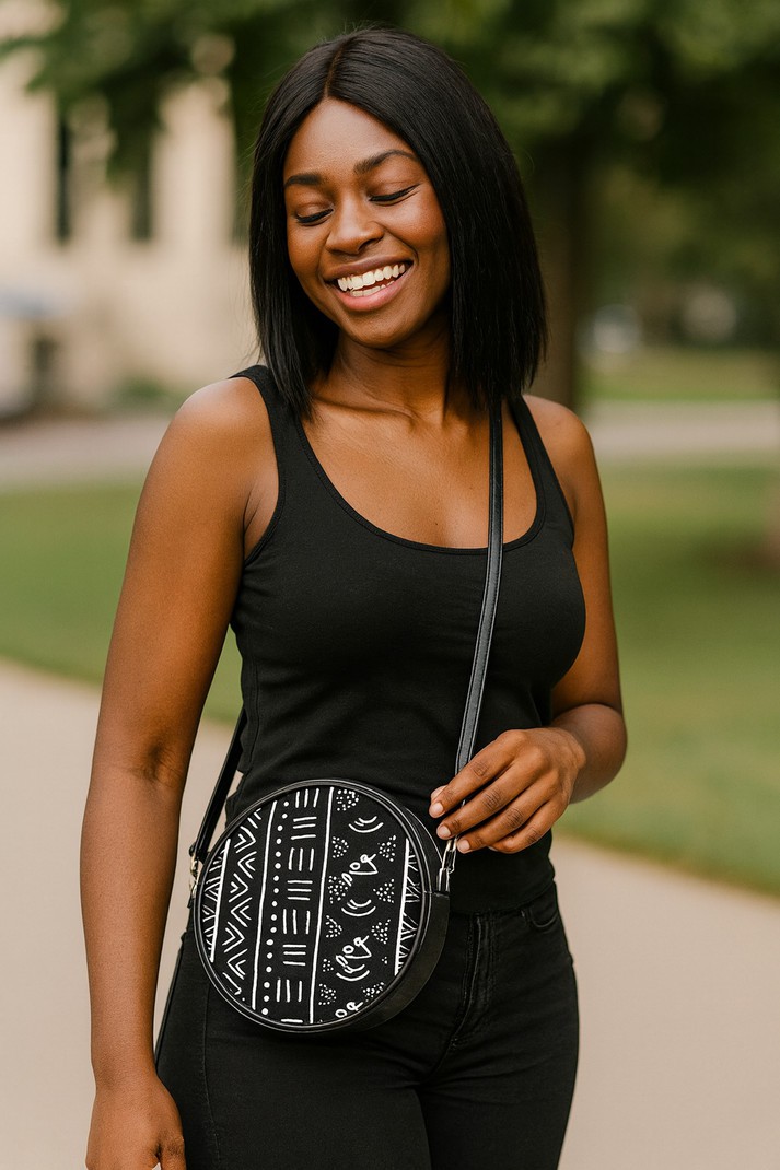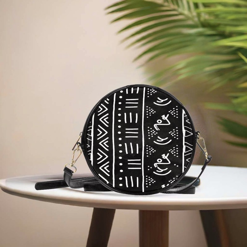 Add an eclectic touch to your outfit with our Round Sling Bag in a striking Mud Cloth Black & White Print. The sleek and compact design makes it perfect for daily use, while the adjustable strap ensures maximum comfort. With its eye-catching print and durable construction, this bag is a must-have for any fashion-forward individual!