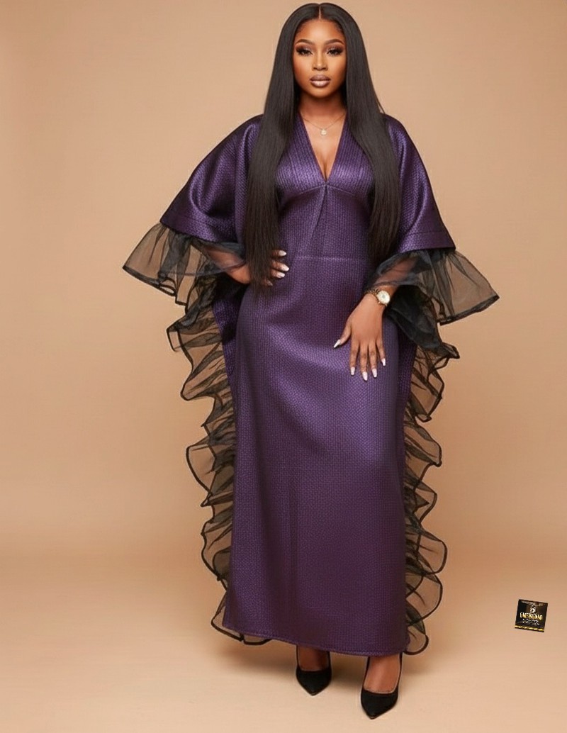 Command the room in this regal purple Shift Dress. Crafted from lustrous satin-finish fabric, this piece is defined by its dramatic, architectural sleeves. Cascading layers of iridescent, sheer organza ruffles run down the sides, creating an ethereal "angel wing" effect. The loose, comfortable fit ensures you look effortlessly glamorous without compromising on comfort.