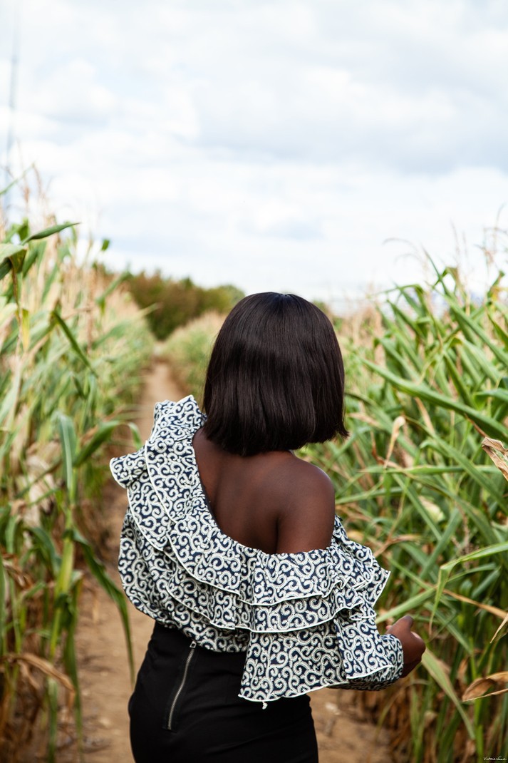 Top asymétrique à volant en wax noir et blanc, manches longues.