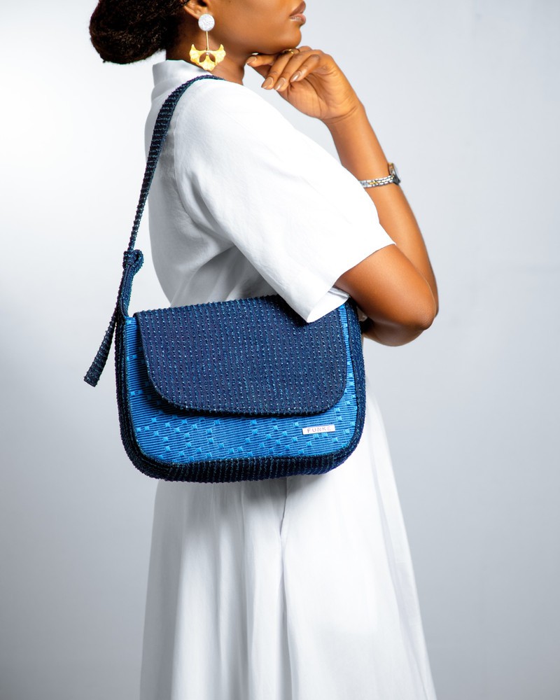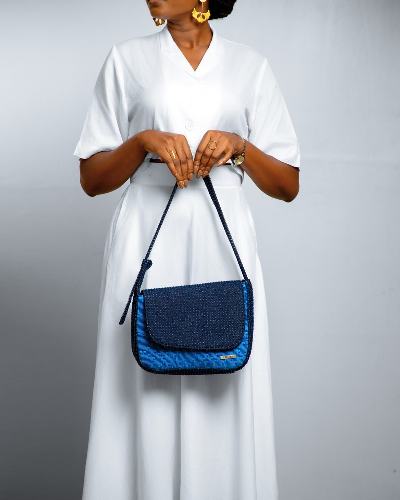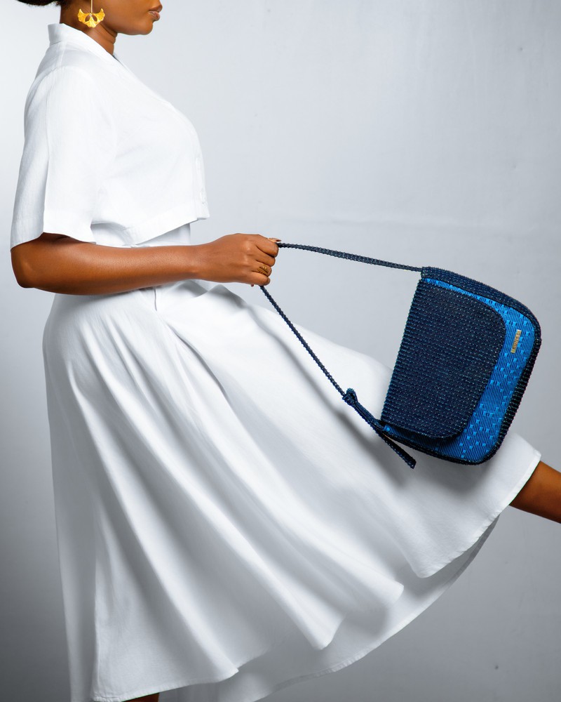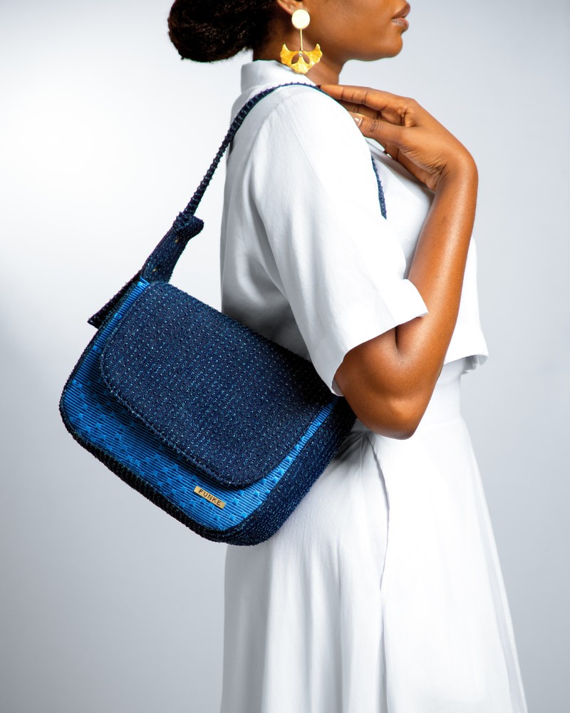 En jean et en pagne tissé, avec sa coupe asymétrique, ce sac allie authenticité et modernité.