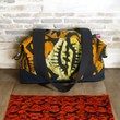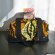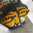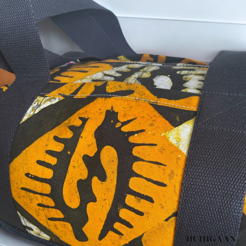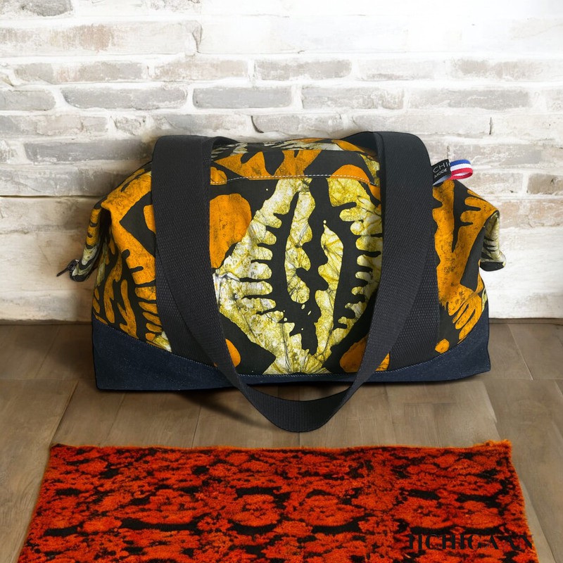 Ce sac de voyage ou grand sac week-end a été réalisé en tissu batik du Nigeria et en jean denim.