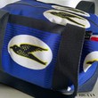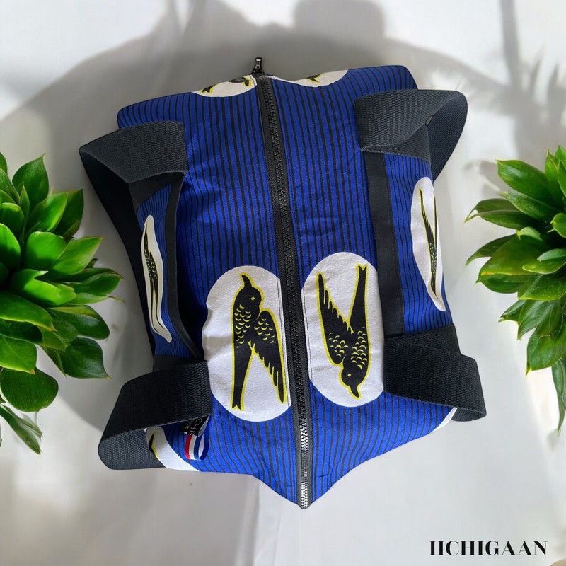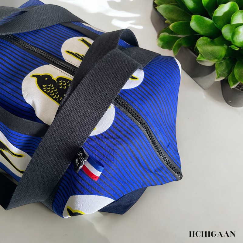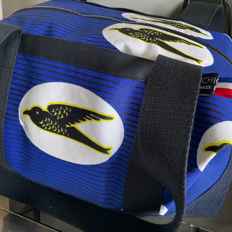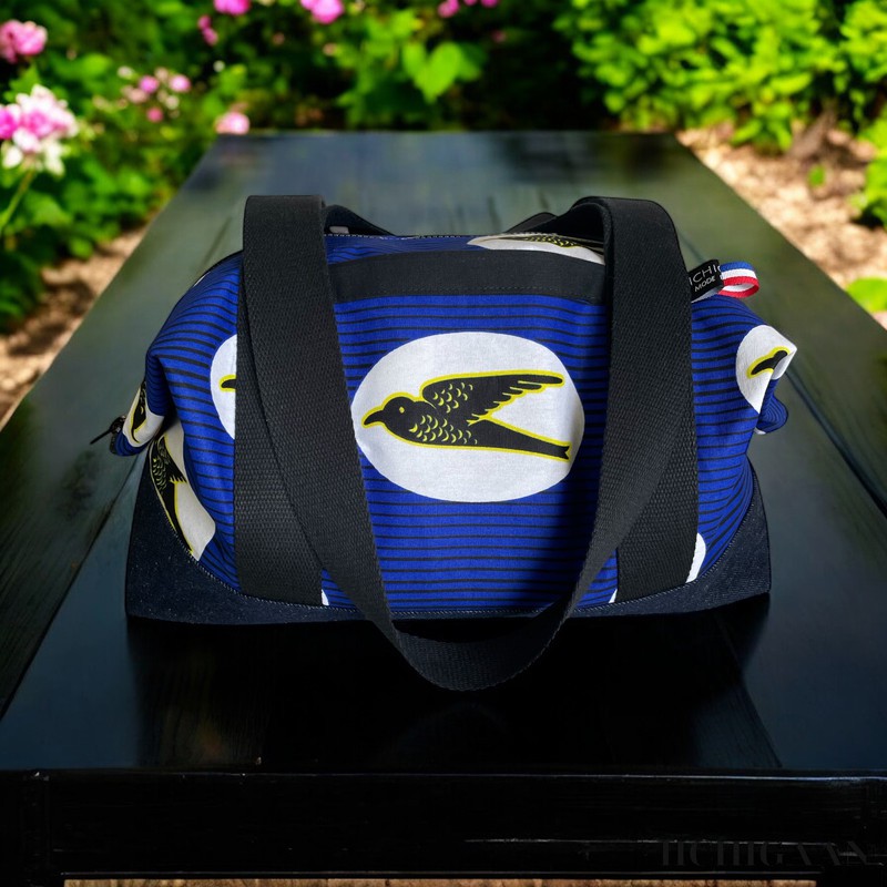 Ce sac de voyage a été réalisé en tissu wax et en jean denim.