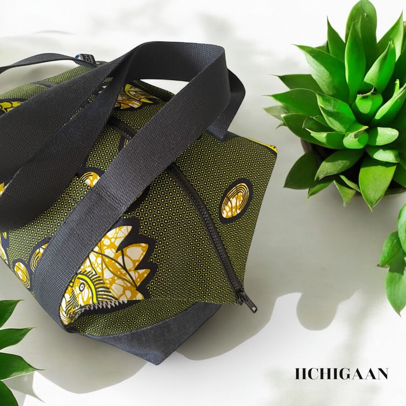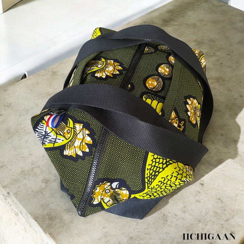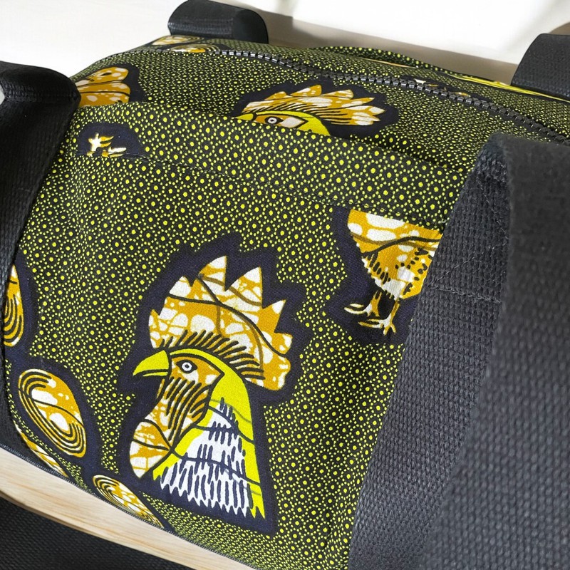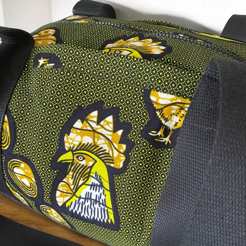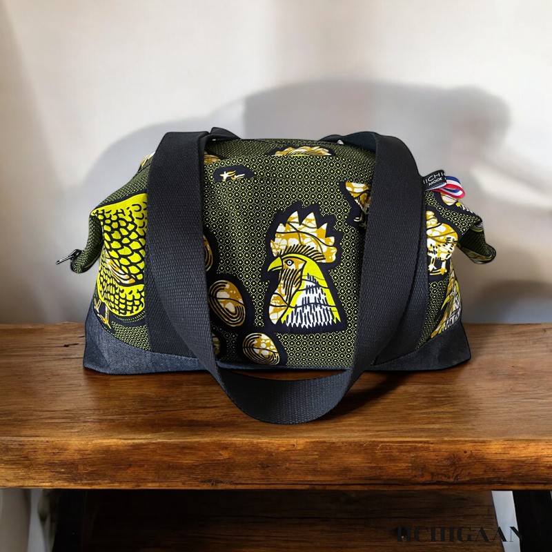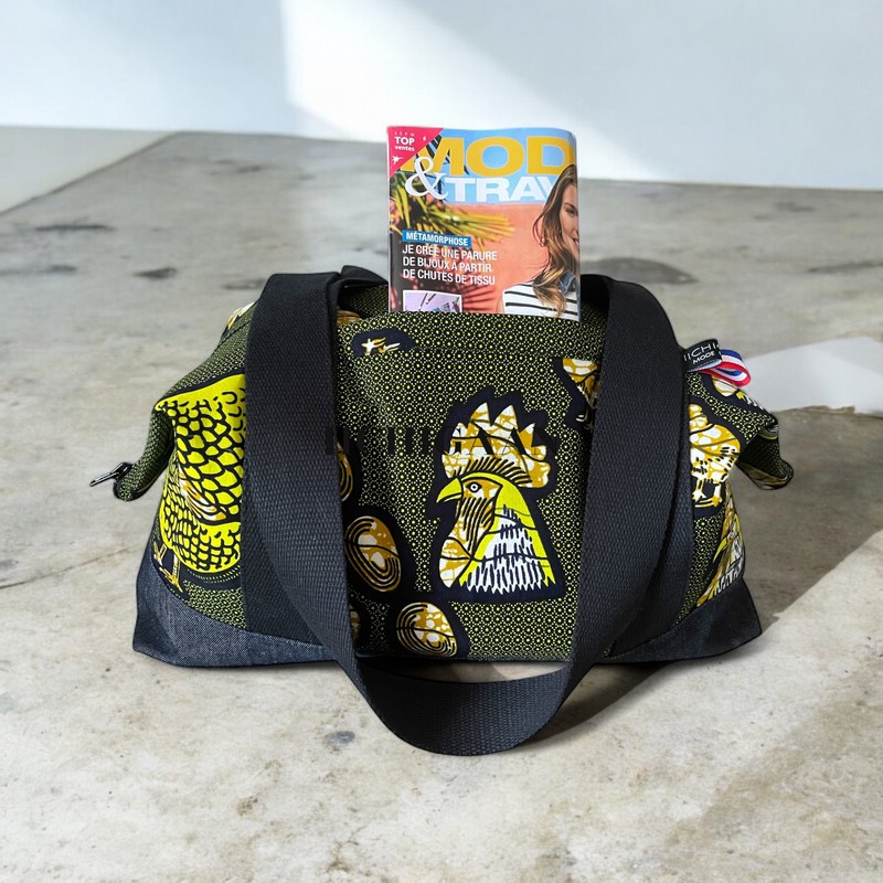 Ce sac de voyage ou grand sac week-end a été réalisé en tissu wax et en jean denim.