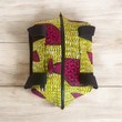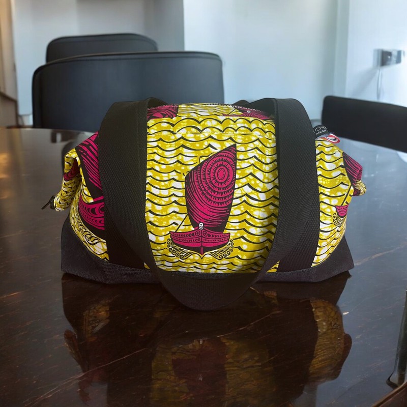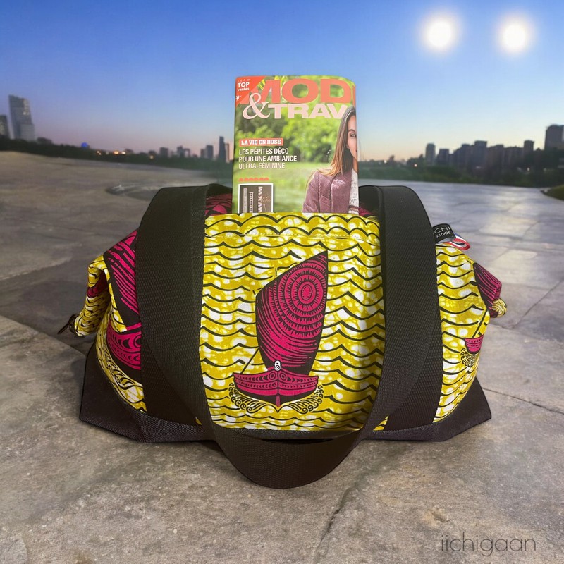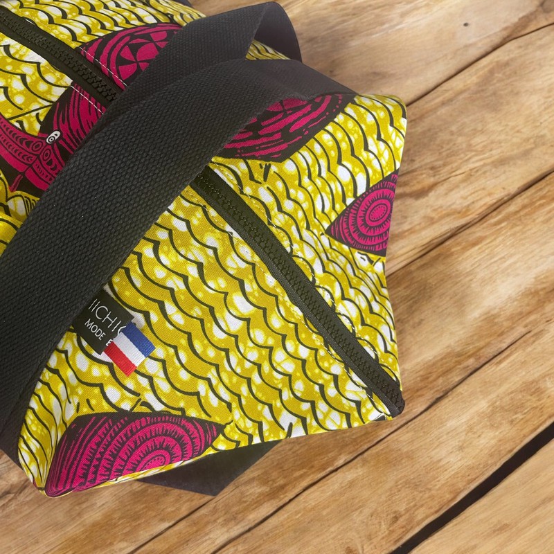 Ce sac de voyage ou grand sac week-end a été réalisé en tissu wax et en jean denim.