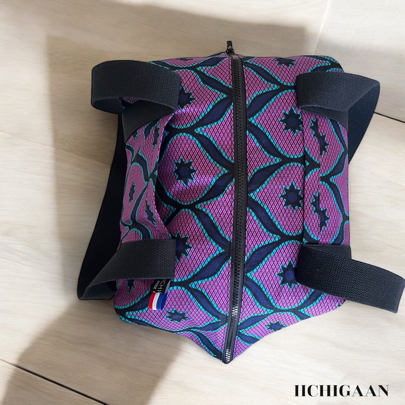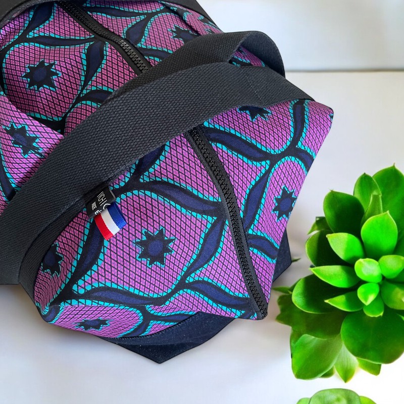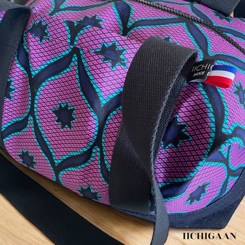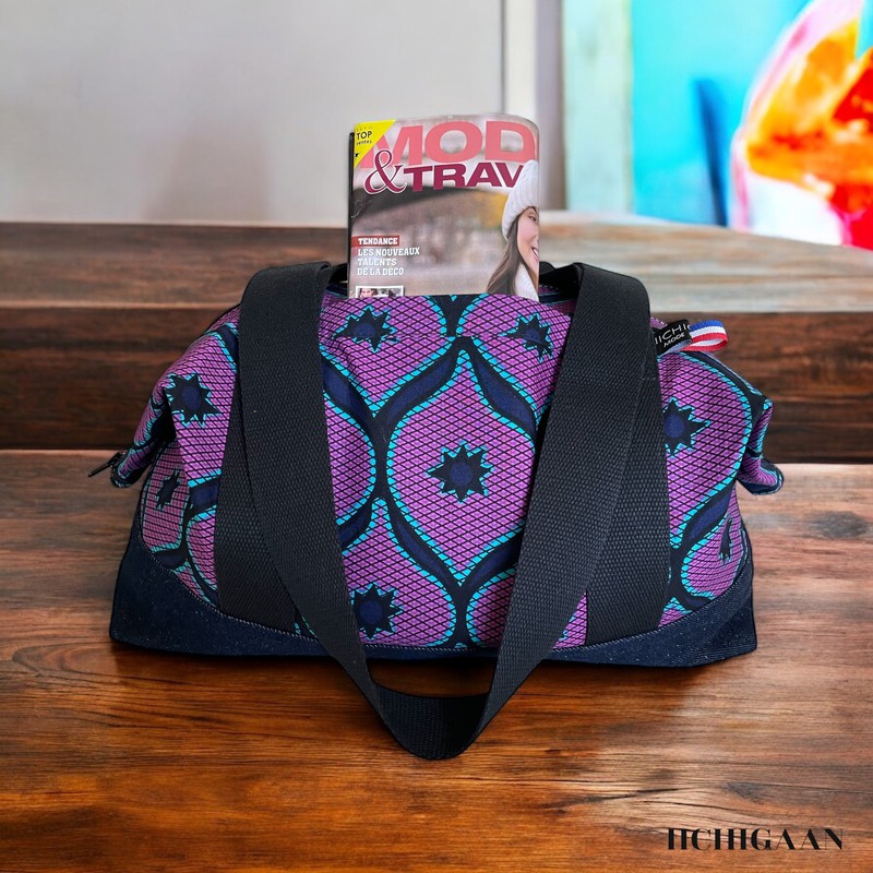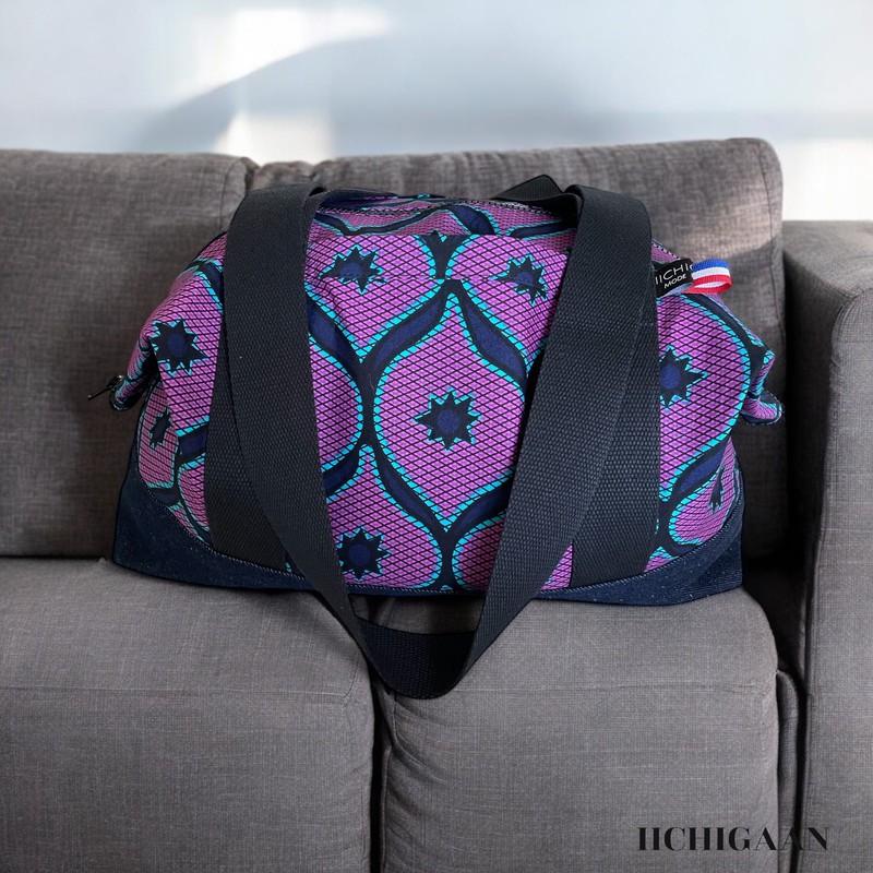 Ce sac de voyage a été réalisé en tissu wax et en jean denim.