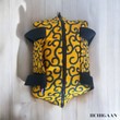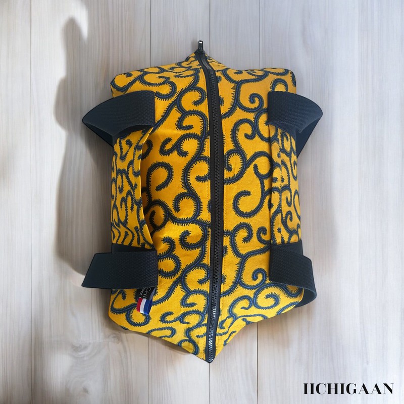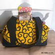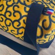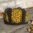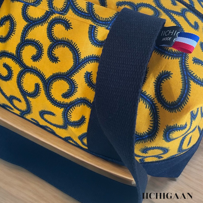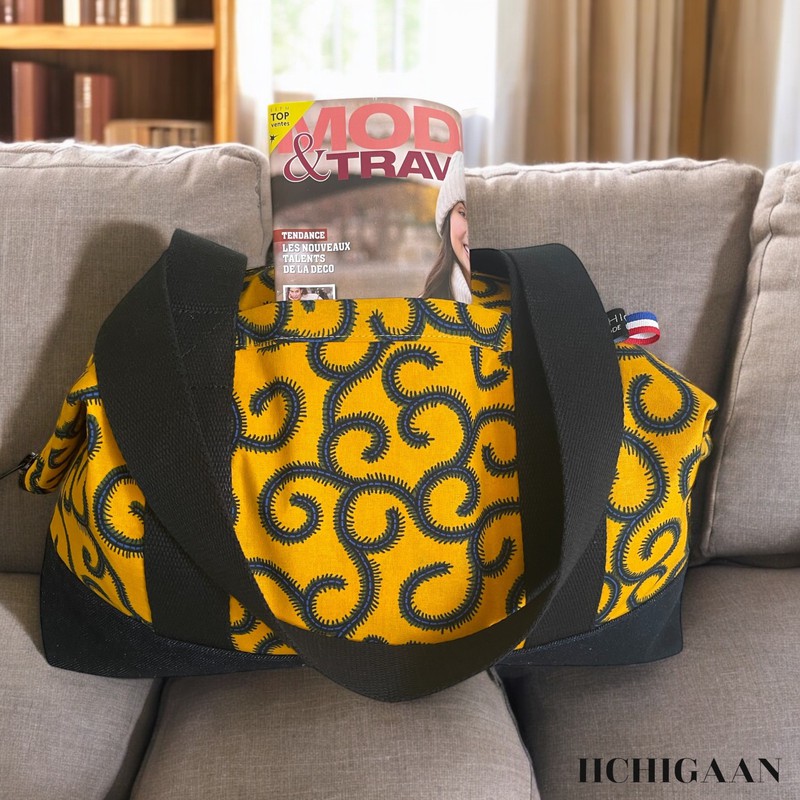 Ce sac de voyage ou grand sac week-end a été réalisé en tissu wax et en jean denim.