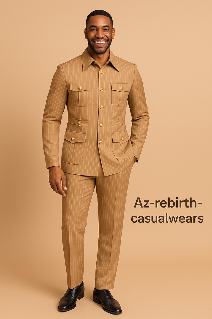 Make a bold statement in this elegant light brown pinstripe safari suit by Az-rebirth-casualwears. Crafted with premium fabric, this suit features gold-tone buttons, flap pockets, and a tailored fit. Inspired by classic military style with a modern African touch, it's perfect for weddings, special events, or stylish occasions.
