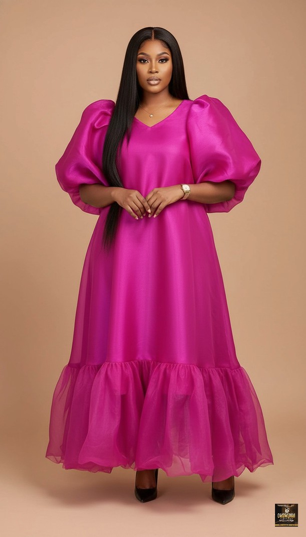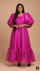 Step into a fairytale with this ethereal Sayin & organza dress. The unique chartreuse-pink color glows against the skin. The dress features an oversized, tent-style silhouette with billowy puff sleeves and a gathered tiered hem. It is romantic, playful, and undeniably high-fashion. Best For Baby showers, garden tea parties, maternity photoshoots, or summer weddings. Material: Sheer organic with satin Color: pink