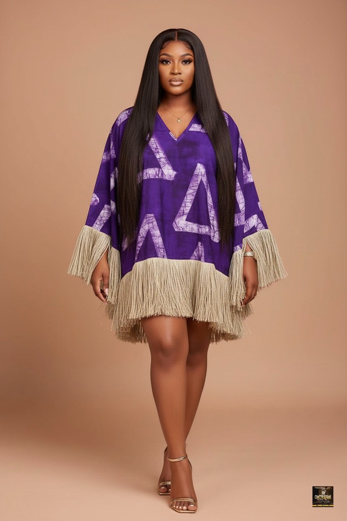 Exude bohemian luxury in this striking Kaftan Maxi Dress, featuring an intricate all-over print of white swirling circular motifs set against a deep purple backdrop. The kaftan boasts an incredibly voluminous and comfortable silhouette with wide, flowing sleeves and a flattering V-neckline detailed with a coordinating crimson trim and decorative tassel. The dress is dramatically finished with a long, dense cream fringe that runs along the entire hemline, adding captivating texture and movement as you walk. Crafted from what appears to be a medium-weight, textured cotton Adire/Batik fabric, this piece offers a beautiful drape and excellent breathability. This glamorous kaftan is the perfect statement for destination weddings, upscale resort wear, elegant outdoor celebrations, or any special event where you want to combine rich color with artistic flair.