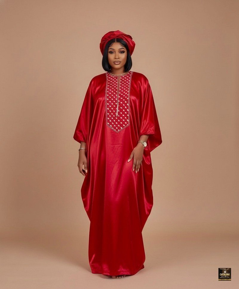 This striking, floor-length kaftan is a vision of luxurious glamour, crafted from a smooth, high-sheen satin fabric in a vivid, passionate shade of cardinal red, ensuring a truly impactful presence. The kaftan features a full, loose silhouette with voluminous batwing sleeves that drape dramatically from the shoulder, emphasizing the richness and fluidity of the fabric. The front is elegantly detailed with a central, structured yoke featuring intricate white and silver embroidery, creating a beautiful geometric pattern that draws the eye and provides a sophisticated contrast to the deep red. This shimmering embellishment adds texture and formality to the garment, making it ideal for celebratory occasions. The ensemble is perfectly completed with a coordinated fabric headwrap, ensuring a polished and richly textured look that exudes effortless style and confidence.