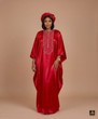 This striking, floor-length kaftan is a vision of luxurious glamour, crafted from a smooth, high-sheen satin fabric in a vivid, passionate shade of cardinal red, ensuring a truly impactful presence. The kaftan features a full, loose silhouette with voluminous batwing sleeves that drape dramatically from the shoulder, emphasizing the richness and fluidity of the fabric. The front is elegantly detailed with a central, structured yoke featuring intricate white and silver embroidery, creating a beautiful geometric pattern that draws the eye and provides a sophisticated contrast to the deep red. This shimmering embellishment adds texture and formality to the garment, making it ideal for celebratory occasions. The ensemble is perfectly completed with a coordinated fabric headwrap, ensuring a polished and richly textured look that exudes effortless style and confidence. Material: satin Color: red