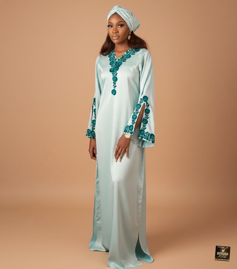This exquisitely tailored maxi dress presents a vision of understated luxury, crafted from a smooth, subtly lustrous satin fabric in a delicate, cool shade of pale mint green, offering an immediate sense of refined elegance. The silhouette is streamlined and floor-length, providing a modest yet flattering drape, while the long sleeves flare gently from the elbow and feature elegant split cuffs that reveal a hint of arm movement. The neckline is beautifully accentuated with intricate, deep teal green embroidery, featuring stylized floral or medallion motifs that flow down the center front of the bodice and echo the detailing found meticulously placed along the edges of the split cuffs. Paired with a matching fabric headwrap, this dress is a perfect choice for formal gatherings or sophisticated events, embodying a graceful fusion of traditional coverage and contemporary polish. Material: satin Color: Turquoise