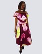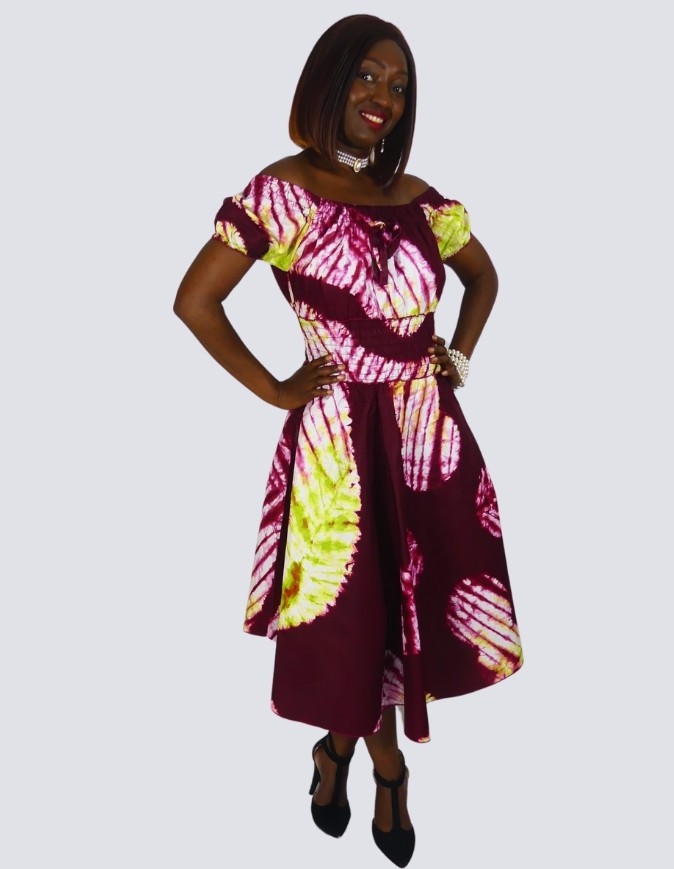 Très Jolie robe évasée imprimée bazin taille genoux. Manches courtes, robe évasée et extensible au buste, ce qui permet une meilleure aisance et la possibilité d’enfiler la robe quelque soit la taille. La jolie évasée, extensible, légère et Idéale pour l’été, se porte en toute occasion.