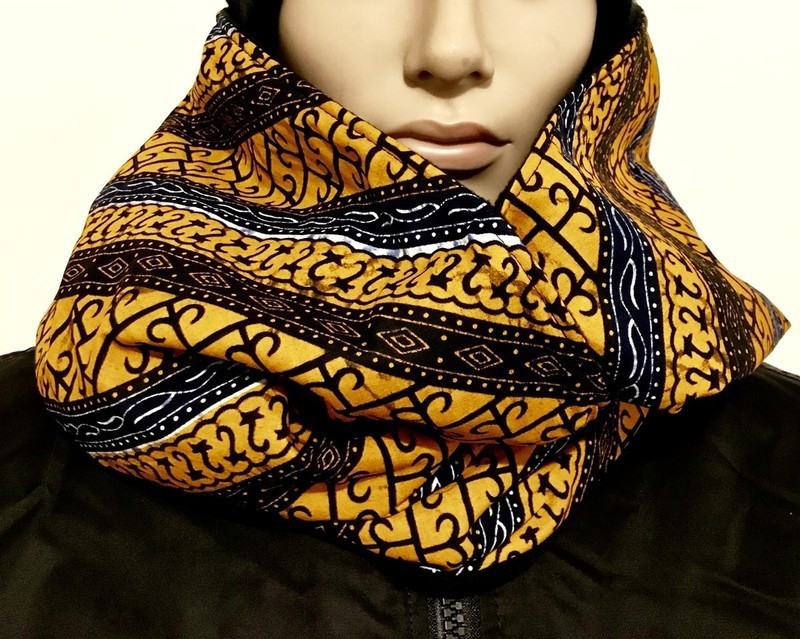 Snood-écharpe en wax doublé en laine polaire. Longueur = 76 cm/ Largeur = 37 cm.