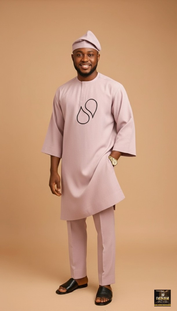 Step into any special occasion with confidence in this elegant Soft Blush Pink/Mauve set. The top features a signature asymmetrical hemline and wide, three-quarter sleeves, giving it a distinct, flowy appeal. The chest is adorned with a sophisticated monogram or droplet-shaped embroidery in a contrasting black line work. The set is traditionally paired with a matching fitted cap (Fila/Agbada cap), making it a refined choice for ceremonies. The fabric is light yet structured, ensuring comfort and a premium drape. Perfect for Engagement parties, Naming ceremonies, formal traditional weddings, or high-profile social events. Material: Cotton, Wool Color: Soft Blush Pink