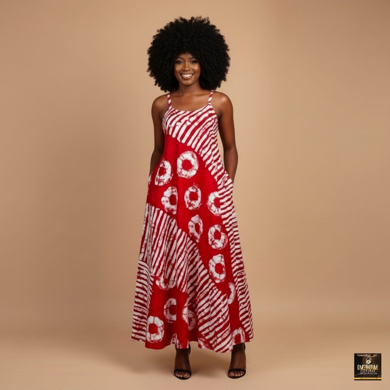 Add a splash of bold elegance to your wardrobe with this red and white adire-inspired maxi dress. Designed with thin spaghetti straps and a flowing silhouette, this dress blends comfort with effortless style. The striking circular and striped tie-dye patterns make it perfect for sunny days, beach outings, or relaxed weekend gatherings. • Material: ankara • Color: red • Neckline: Scoop neck with adjustable spaghetti straps • Length: Full maxi • Details: Red and white hand-dyed patterns with a flowy finish • Fit: Relaxed, breathable, and flattering • Care: Hand wash separately in cold water and line dry