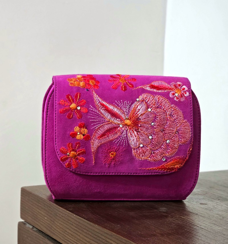 Elevate your essentials with this suede purse, where refined texture meets artisanal detail. The design features a smooth suede body finished with an embroidered flap, adding a touch of artistry to a timeless silhouette. • Craftsmanship: Soft, durable suede exterior with intricate embroidery for a statement finish. • Interior: Lined with premium leather, both offering structure and lasting quality. • Design: Compact yet practical, perfect for day-to-night elegance. A purse that balances subtle luxury and handcrafted charm, made to be treasured for years to come.