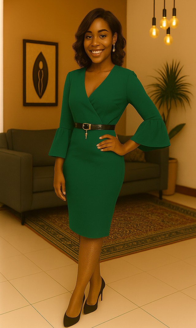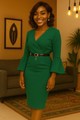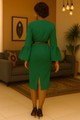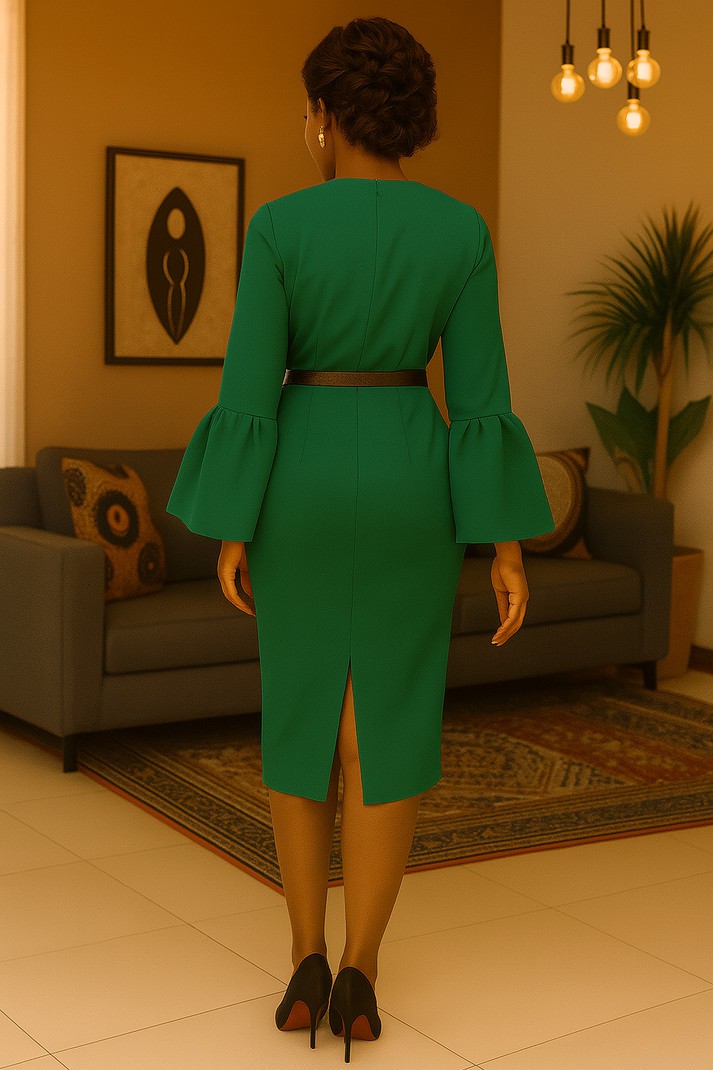 Make a bold impression with this statement green dress featuring dramatic bell sleeves and a flattering faux wrap design. The fitted midi cut enhances your silhouette while providing comfort and elegance. Perfect for occasions where you want to feel confident and stand out with effortless style.