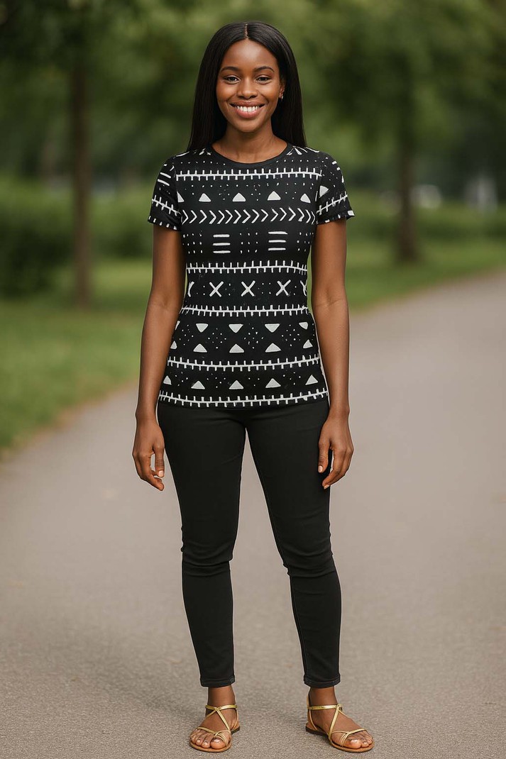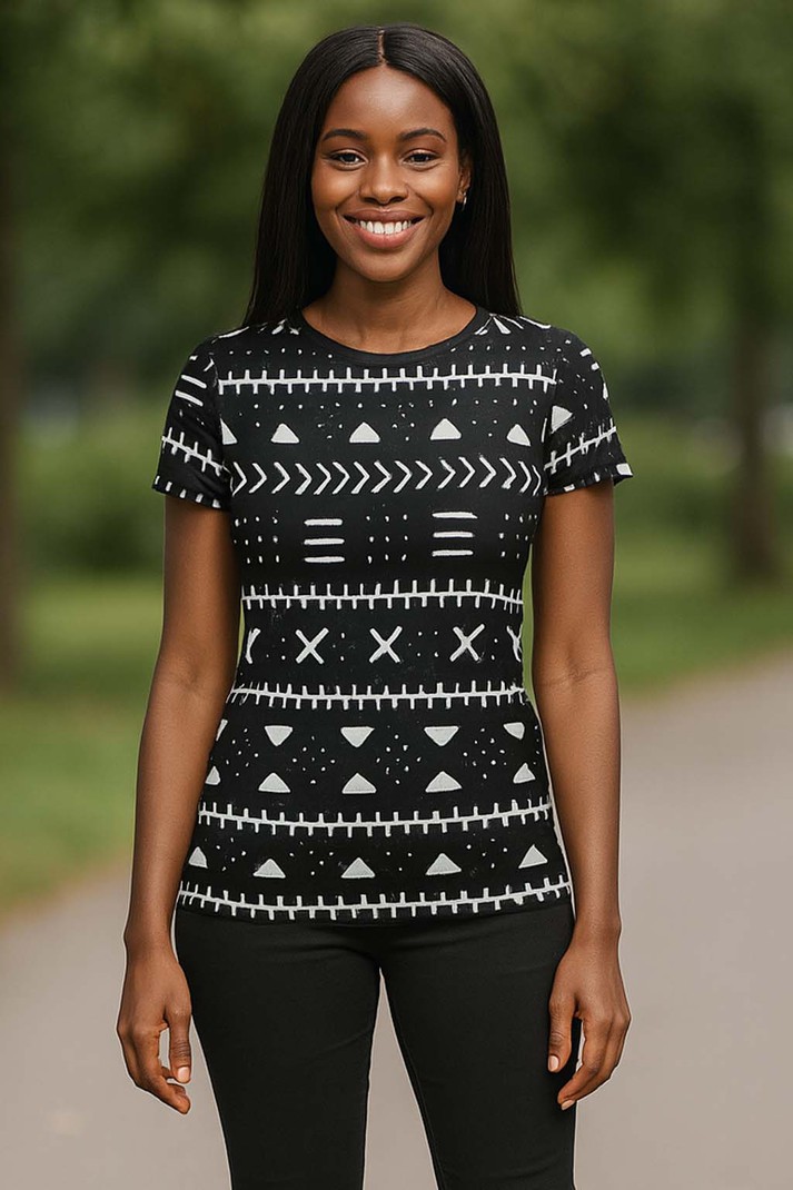 This Tribal Women T-shirt features an authentic African black and white print, perfect for adding a unique touch to any outfit. Made with high-quality material, it offers comfortable wear and stylish design for the modern woman. Celebrate cultural diversity with this one-of-a-kind T-shirt.