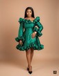 This enchanting mini-dress is a romantic and high-fashion statement piece, crafted from a luxurious, lustrous fabric, satin, in a delicate green hue, giving it a beautiful sheen and structure. The dress features a dramatically ruched off-the-shoulder neckline, which extends into long sleeves that flare out at the wrist, creating voluminous, tiered ruffle cuffs that mirror the detailing at the shoulders. The bodice is fitted and structured, cinching the waist before flowing into a short, A-line skirt that is finished with a large, elaborate hemline ruffle. Adding a classic touch, the front of the dress is adorned with a line of matching pink buttons running down the center. This design is a perfect blend of feminine drama and playful elegance, making it a truly unforgettable garment. This stunning and elaborate mini-dress is ideally suited for special celebratory occasions and elegant evening events. It is the perfect choice for a birthday party, a cocktail reception, a bridal or baby shower, a graduation celebration, or a romantic date night where a statement-making, glamorous look is desired. Material: Satin Color: green