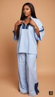 This stunning ensemble, reminiscent of the stylish kaftan and trouser sets, is crafted from a light blue fabric featuring subtle white pinstripes, offering a refreshingly chic and comfortable aesthetic. The loose-fitting tunic top boasts a deep V-neckline accented with contrasting bands of dark blue and white stripes, creating a bold visual focal point that draws the eye. The top's wide, elbow-length kimono-style sleeves feature the same contrast stripe detail near the cuff, enhancing the garment's relaxed yet structured silhouette. Paired with matching wide-leg trousers, which feature the same contrasting stripe detail elegantly placed at the hem, this outfit achieves a harmonious and elongating effect. The overall design is a sophisticated fusion of traditional ease and modern tailoring suggesting an elevated casual appeal. This sophisticated pinstripe set is perfect for a variety of semi-formal and smart-casual occasions. It would be an excellent choice for outdoor events, brunches, resort wear, or daytime parties where you want to maintain a polished yet comfortable look. It is also highly suitable for a creative work environment or a business-casual setting where style and comfort are key. Material: cotton & handwoven aso-oke Color: Blue