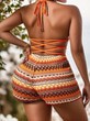 Striped Pattern Knitted Shorts Set, Vacation Halter Neck Lace-up Cut Out Crop Top & High Waist Skinny Shorts Outfits, Women's Clothing