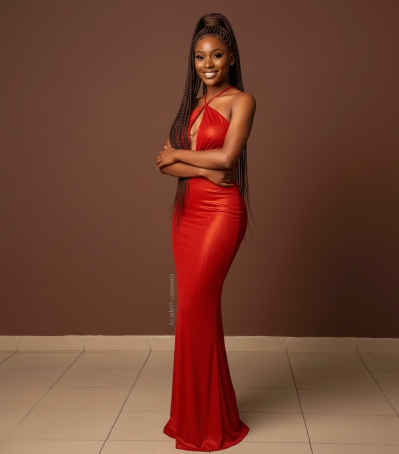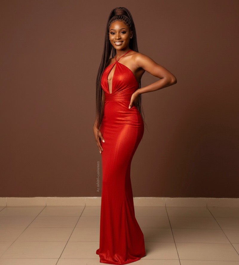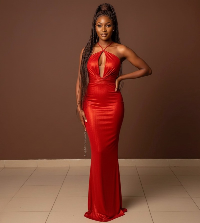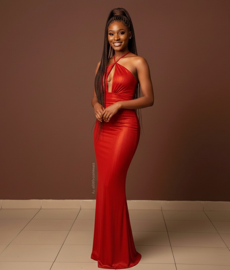 Stunning Red Metallic Halter Gown Turn heads in this striking floor-length gown featuring a shimmering red metallic fabric. It has a flattering halter neckline with a cut-out plunge detail on the bust and a backless design that flows into a sleek mermaid/trumpet silhouette. Perfect for proms, galas, and formal events. Available in all sizes.